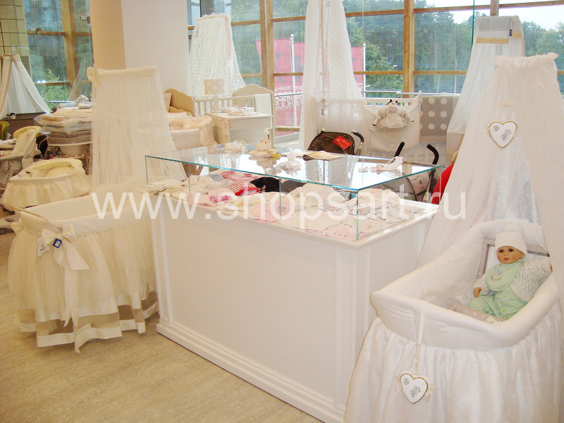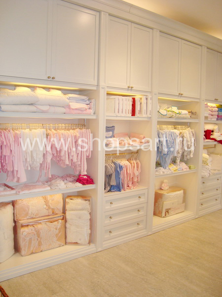 Фотографии торгового оборудования в открытом детском магазине “Винни”, третий этаж в ТЦ “Dream House”, Барвиха, на основе коллекции торговой мебели «БЕЛАЯ КЛАССИКА»