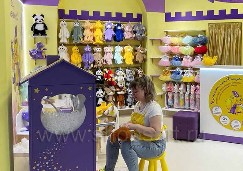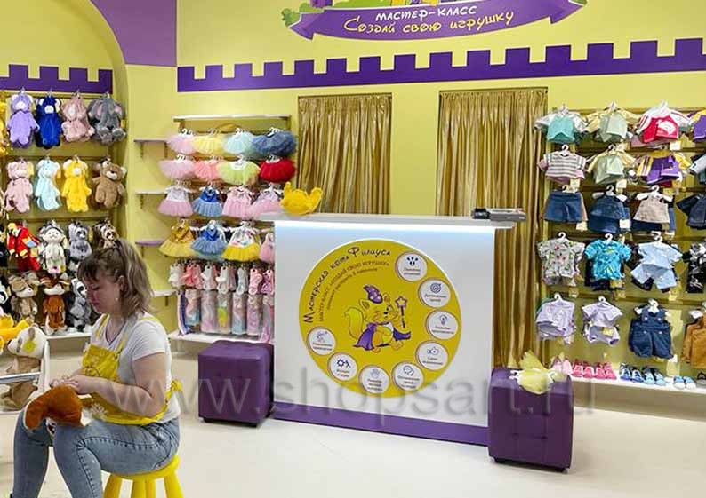 Дизайн интерьера “Мастерская мягких игрушек кота Филиуса”, ТРК “Гранд Каньон”, г. Санкт-Петербург, на основе коллекции торгового оборудования «МАМИН ДОМ»