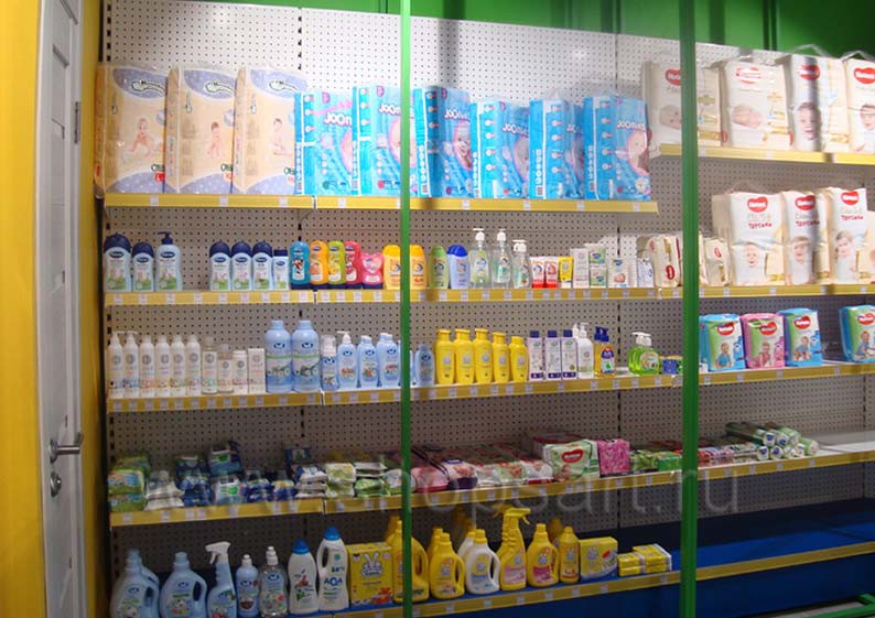 Такое оборудование очень удобно для размещения и презентации игрушек, различных аксессуаров для детей и продукцию для новорожденных. Товары для младенцев желательно размещать на средней высоте (примерно на расстоянии 120 см от пола). Так вы обеспечите комфортное совершение покупок беременным или только недавно родившим женщинам, ведь им не придется наклоняться за необходимыми их малышам изделиями. Если вы хотите увидеть, как выглядит образцово оформленное коммерческое помещение, посмотрите на фотографии торгового оборудования детского магазина в Green Park, коллекция Цветные металлические стеллажи. Такое функциональное и стильное оснащение обязательно привлечет покупателей.