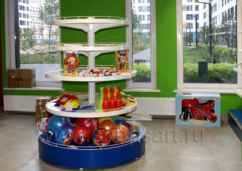 Интересным вариантом оснащения детского магазина являются овальные стеллажи. Также удобны в использовании и вместительны стеллажи, оснащенные сетчатыми корзинами, и конструкцией с перфорацией. Однако установку последних двух видов оборудования необходимо выполнять на достаточно высоте. Этого требуют правила безопасности при оснащении детского магазина.
