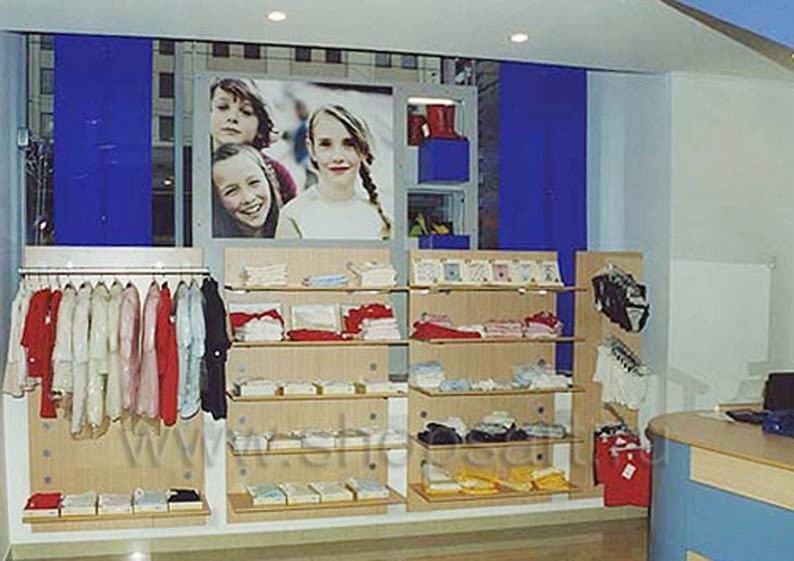 Мебель следует выбрать такую, чтобы она была удобной и для маленьких посетителей, и для их родителей. Для этого следует уметь правильно использовать торговое оборудование. На нижних полках разместите товары, которые заинтересуют дошкольников. Так мамам не придется наклоняться для того, чтобы взять в руки понравившуюся ребенку вещь. Лучший обзор моделей обеспечивает их развешивание на кронштейнах. Так они заметны посетителям лучше, чем в сложенном виде на полках.
