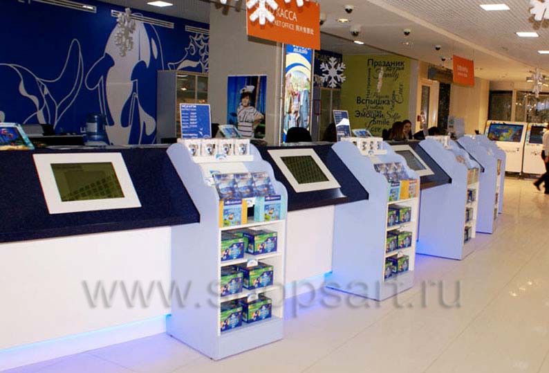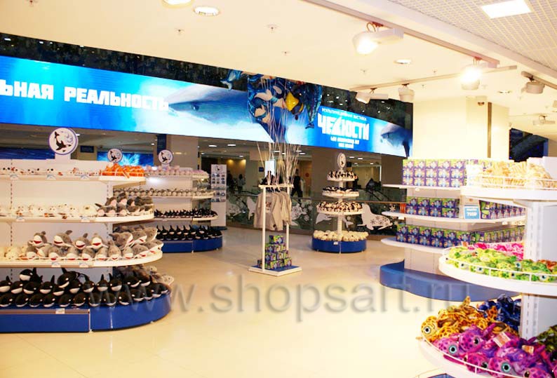 На этой странице Вы можете ознакомиться с фотографиями торгового оборудования детского сувенирного магазина, находящегося в городе Москве, ВДНХ, проспект Мира, 119 стр.23, в научно-развлекательном комплексе океанариума и дельфинария Москвариум, в зоне входа-выхода, на основе коллекции торгового оборудования «ЦВЕТНЫЕ МЕТАЛЛИЧЕСКИЕ СТЕЛЛАЖИ». Разработала и поставила торговую мебель: торговые стеллажи, овальные стеллажи, пристенные стеллажи и другую торговую мебель компания «Искусство интерьеров». Узнать больше о наших коллекциях мебели для магазинов Вы можете на странице торгового оборудования для детских магазинов.