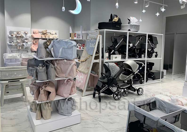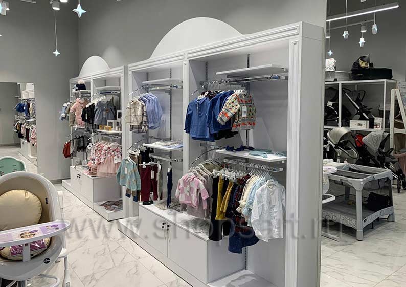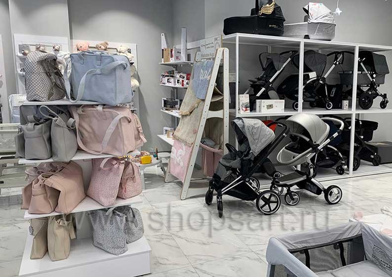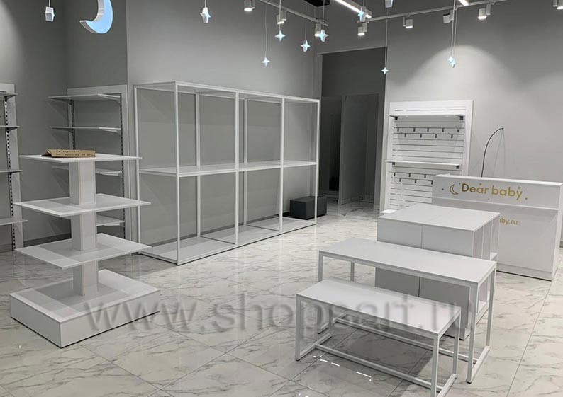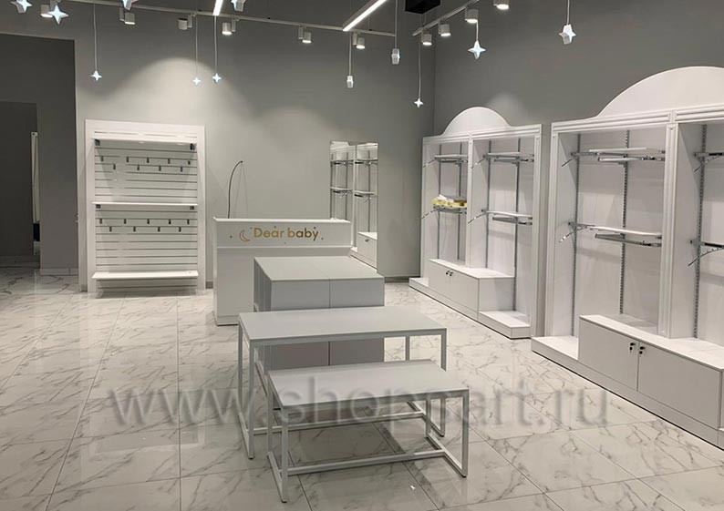 Если в магазине наряду с детской одеждой продается и обувь для мальчиков и девочек, то понадобится применение соответствующего торгового оборудования (демонстрационных столов, стеллажей, полок и островных конструкций).