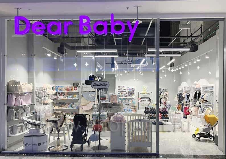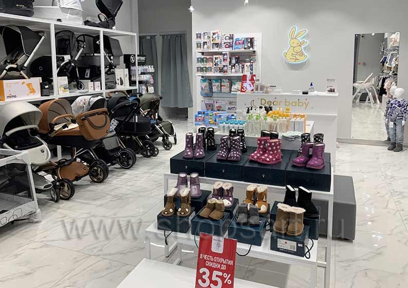 На этой странице Вы можете ознакомиться с фотографиями торгового оборудования в открытом магазине детской одежды «Dear Baby», находящемся в ТРЦ “Ривьера”, Автозаводская улица, 18, город Москва, на основе коллекции торговой мебели «БЕЛАЯ КЛАССИКА».