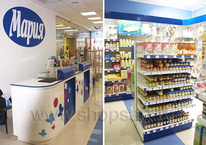 Привлекательное оформление торгового зала обеспечит применение стильной серии конструкций под названием «Голубая лагуна». Мебель одинаково эффектно смотрится в небольших детских магазинах и крупных оптово-розничных центрах. Это действительно так. Посмотрите, к примеру, на фотографии торгового оборудования магазина детской одежды магазина Мария, Горки-10, МО, коллекция ГОЛУБАЯ ЛАГУНА. Здесь использованы функциональные системы “Four”, “Neo fix” и “Global”. Это удобное решение, позволяющее правильно организовать размещение детских изделий.