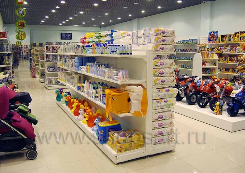 - Безопасность. Это ключевое требование к оснащению любого магазина, который посещают малыши. Используемая в таких заведениях торговая мебель не должна иметь острых углов и элементов, способных травмировать детей.