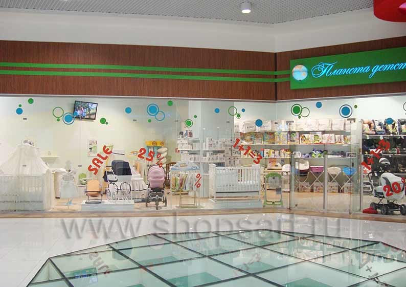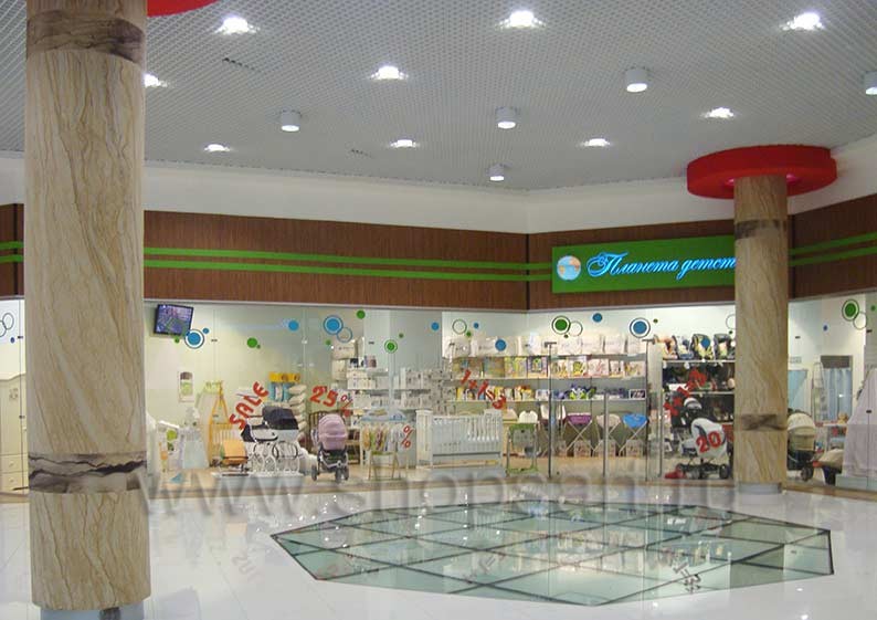 Дизайн интерьера магазина детской одежды “Планета детства”, ТРЦ «Азовский» г. Москва, на основе коллекции торгового оборудования «ГОЛУБАЯ ЛАГУНА»