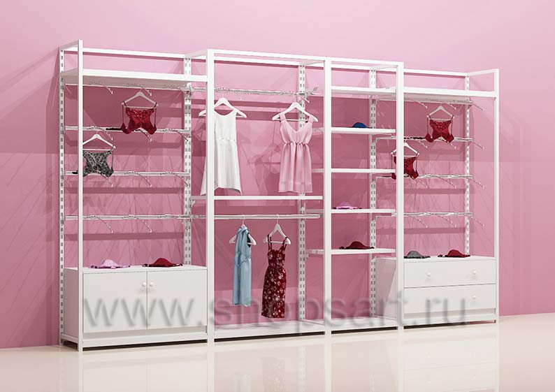 - Пристенные стеллажи. Эти конструкции удобно использовать для размещения большого количества нижнего белья благодаря их вместительности. Желательно отдавать предпочтение стеллажам, в которых производителями предусмотрена возможность регулировки положения навесных крючков. Такое оборудование для одежды или белья позволяет посетителям магазина не обращаться за помощью к продавцу каждый раз, когда им необходимо хорошо рассмотреть высоко расположенный товар. Приглянувшуюся сорочку или любое другое нижнее белье можно будет взять в руки, просто опустив крючок к себе.