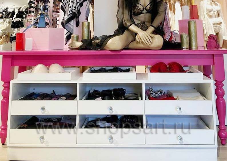 - Прилавки. Они также вам понадобятся для полноценного оснащения магазина белья. На прилавках нередко размещают сопутствующие товары (такие, как подвязки и т.д.).