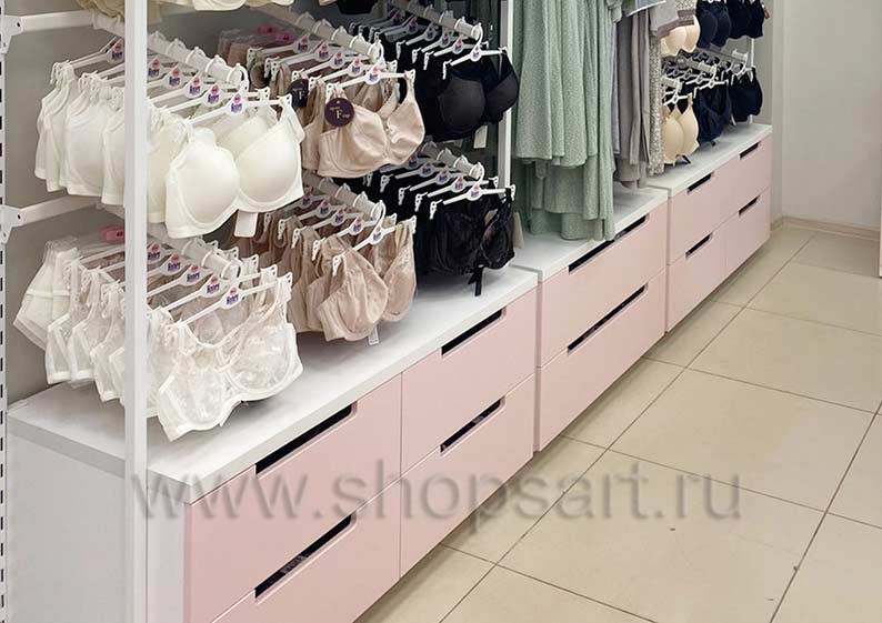 Презентацию бельевых комплектов удобно выполнить, используя вешалки. Их размещают на стеллажах, оснащенных перекладинами из металла либо кронштейнами. Нередко в магазинах белья продаются сопутствующие товары (например, колготки, чулки, домашняя одежда). Их можно разместить на стеллажах, оснащенных полками. Очень удобны в применении торговые конструкции, укомплектованные накопителями для хранения товаров.