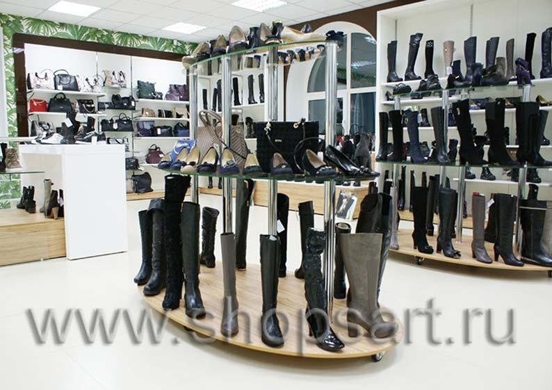 Очень удобна в применении торговая стойка вращающегося типа на колесиках. Она оснащается полками, на которых размещают обувную продукцию. Такие конструкции изготавливаются из качественного металла и отличаются устойчивостью. Для посетителей они удобны тем, что можно, вращая это торговое оборудование для обуви, увидеть за считанные секунды широкий ассортимент изделий. В зависимости от площади коммерческого помещения и разнообразия моделей потребуется приобрести две или три вращающиеся стойки.