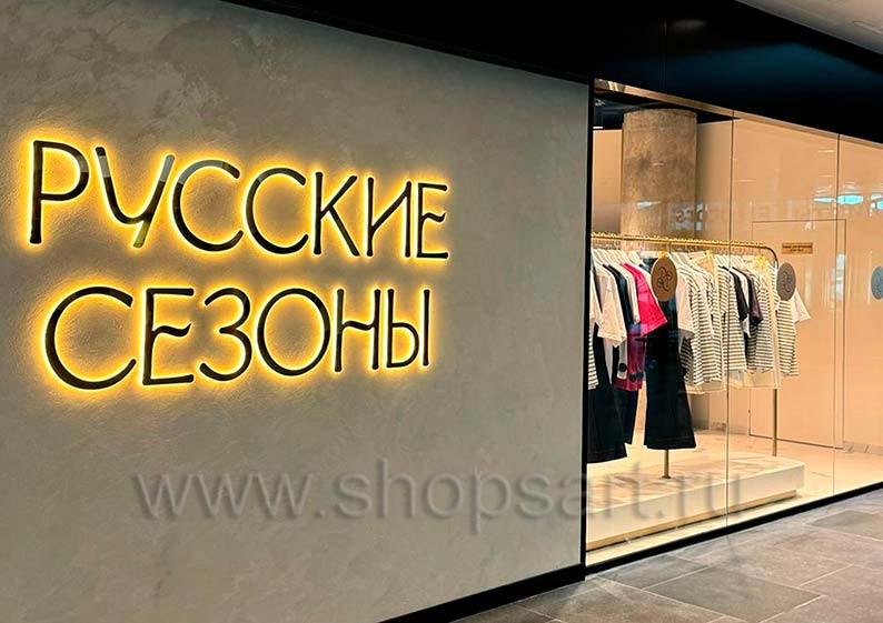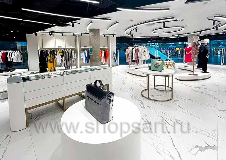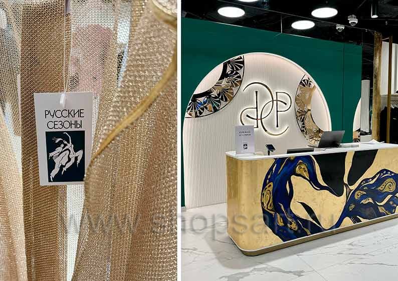 Стильное и функциональное оснащение демонстрируют фотографии торгового оборудования магазина одежды РУССКИЕ СЕЗОНЫ аэропорт Пулково коллекция ЗОЛОТАЯ ЛИНИЯ. Заказать его можно, используя наши контактные данные.