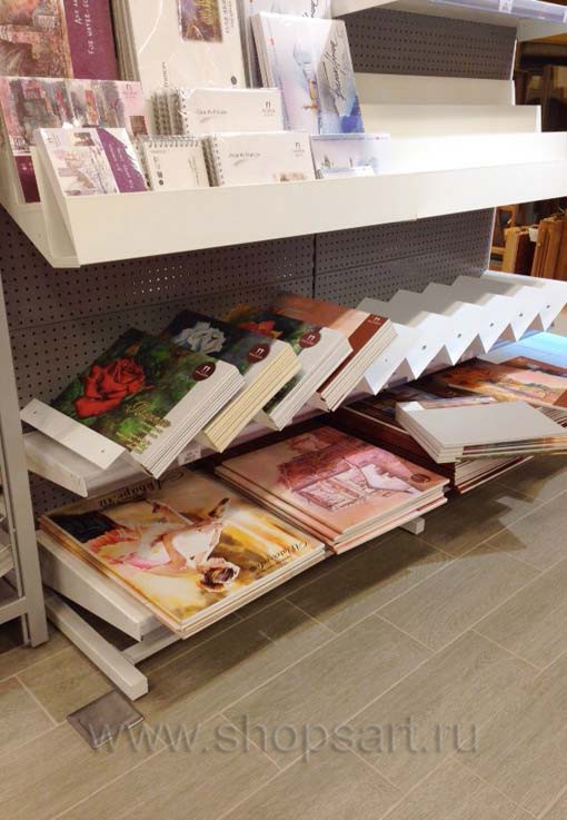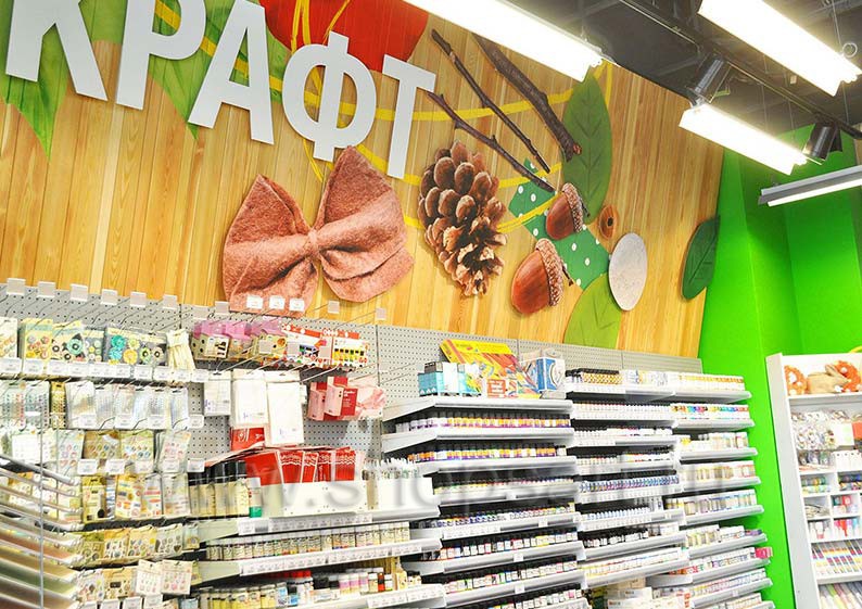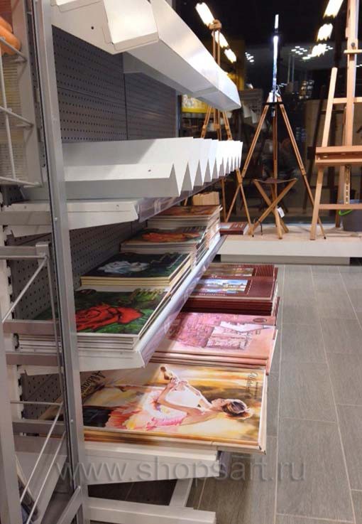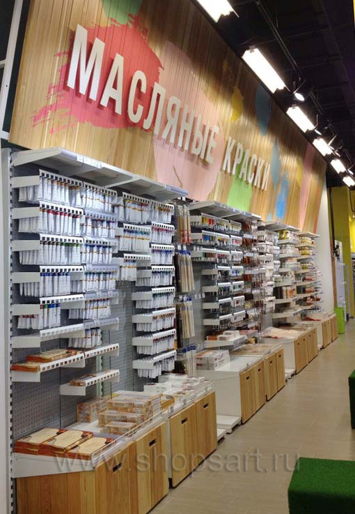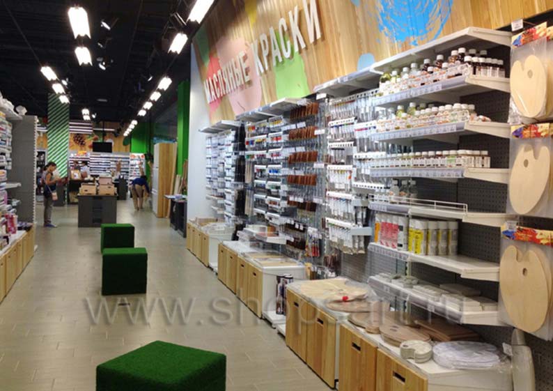 В качестве торгового оборудования магазина «Передвижник» были выбраны практичные и вместительные линии пристенных стеллажей, двухсторонние и четырехсторонние островные стеллажи, островные конструкции с радиусными полками. С учетом того, что в магазине представлено большое количество товаров разных групп, от красок и карандашей до книг и альбомов, мебель выбиралась с особой тщательностью. Учитывалось, что все товары должны быть в зоне доступа покупателей, поэтому некоторые отделы магазина оборудованы перфорированными стеллажами и стеллажами с дополнительными креплениями для вывешивания отдельных видов продукции.
