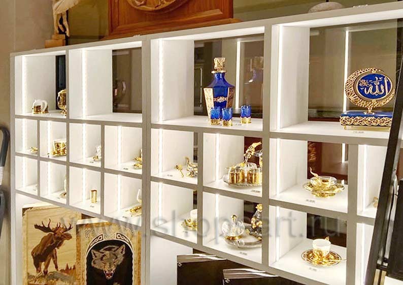 Разумеется, разные категории подарков недопустимо размещать на одном стеллаже или витрине. Так, в застекленных витринах будут эффектно смотреться украшения (колье, ожерелье и т.д.). Стеллажи островного типа уместно применять для демонстрации подарочных наборов декоративной и уходовой косметики, а также для размещения посуды. Шкафы удобно использовать для презентации сувениров.