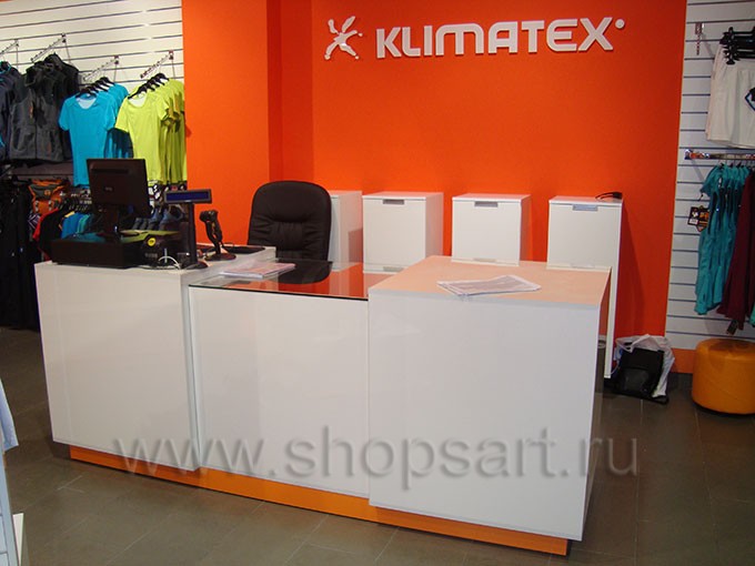 В функциональности и стильном дизайне этой мебели можно убедиться, посмотрев фотографии торгового оборудования магазина спортивной одежды KLIMATEX, коллекция АТЛАНТ.