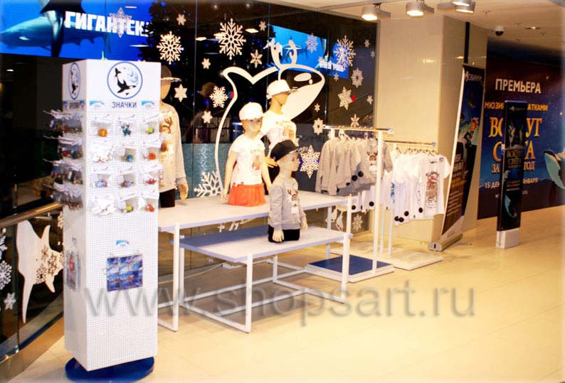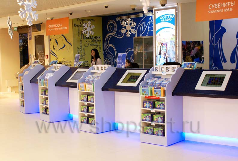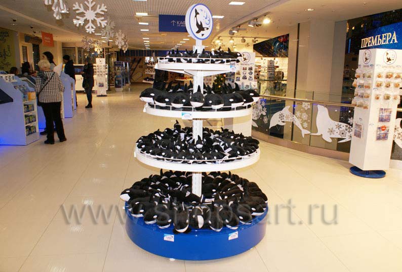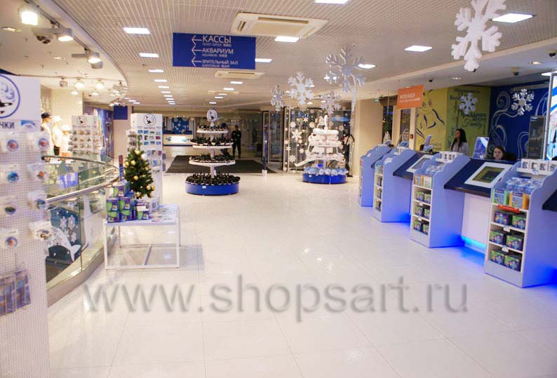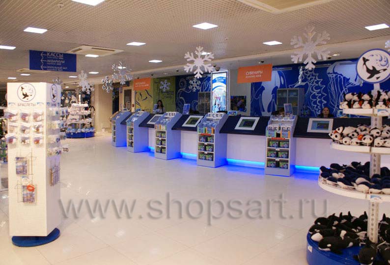 На этой странице Вы можете ознакомиться с фотографиями торгового оборудования в открытом магазине сувениров, находящегося в городе Москве, ВДНХ, проспект Мира, 119 стр.23, в научно-развлекательном комплексе океанариума и дельфинария Москвариум, в зоне входа-выхода, на основе коллекции торгового оборудования «БРЕНДИРОВАННЫЕ СТЕЛЛАЖИ». Разработала и поставила торговую мебель: торговые стеллажи, овальные стеллажи, пристенные стеллажи и другую торговую мебель компания «Искусство интерьеров». Узнать больше о наших коллекциях мебели для магазинов Вы можете на странице торгового оборудования для магазинов и бизнеса.