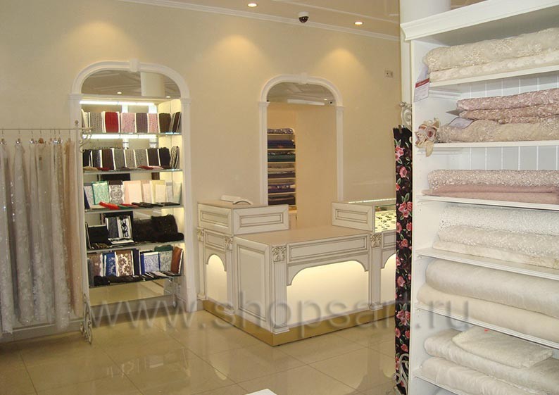 На этой странице Вы можете ознакомиться с фотографиями торгового оборудования в открытом салоне эксклюзивных тканей “Donna», находящемся в городе Москве, улица Малая Никитская, дом 33, этаж 1, на основе коллекции торговой мебели “ЭЛИТ ГОЛД”. Произвела и поставила в магазин оборудование для магазина тканей: острова для магазина тканей, шкафы для магазина тканей, витрины для магазина тканей и прилавки для магазина тканей компания ООО «Искусство интерьеров». Узнать больше о наших коллекциях мебели для магазинов тканей и одежды Вы можете на странице оборудования для одежды в Москве.