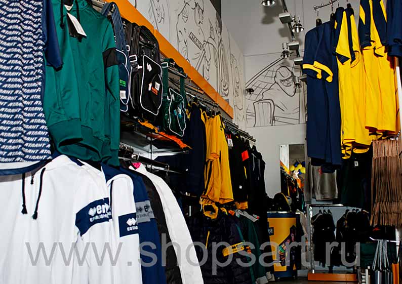 Функциональное оборудование для спортивной одежды и других специализированных товаров – будь то металлические островные или пристенные торговые стеллажи , витрины, подиумы или прилавок продавца — должно отличаться компактными размерами и не загромождать пространство. Рекомендуется использовать торговые конструкции, оснащенные накопителями с выдвижными ящиками. Если в магазине представлена одежда, необходимо наличие примерочных кабин. Внутри них следует установить большие зеркала.