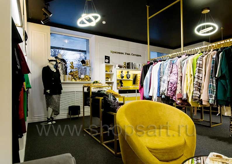 - Зеркала и мягкая мебель. Соответствующая торговая мебель необходима не только для размещения моделей одежды, но также для комфортной примерки. Большие зеркала позволят увидеть свой новый образ, а удобные кресла и банкетки точно не покажутся милым дамам лишними.