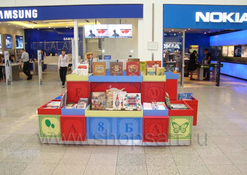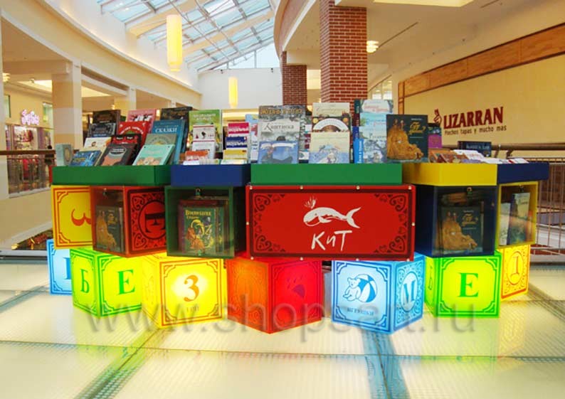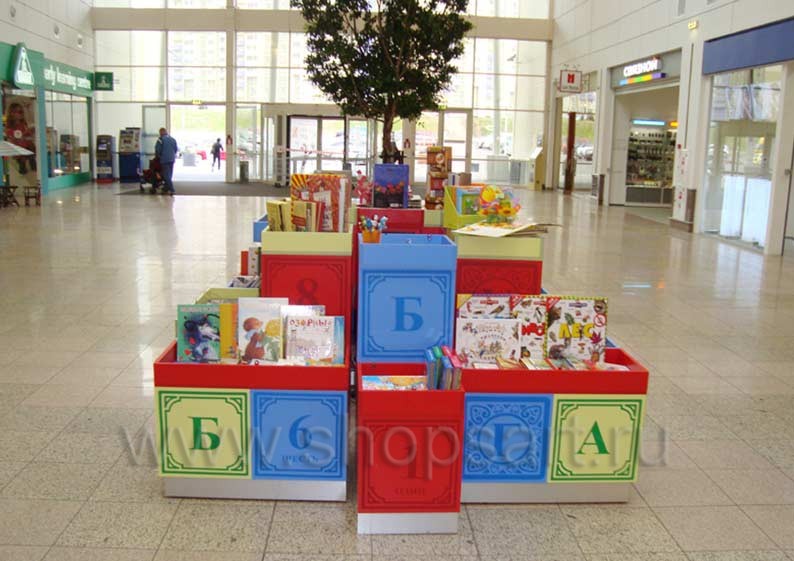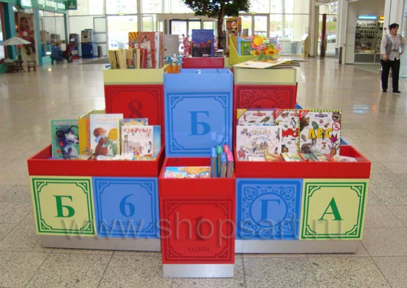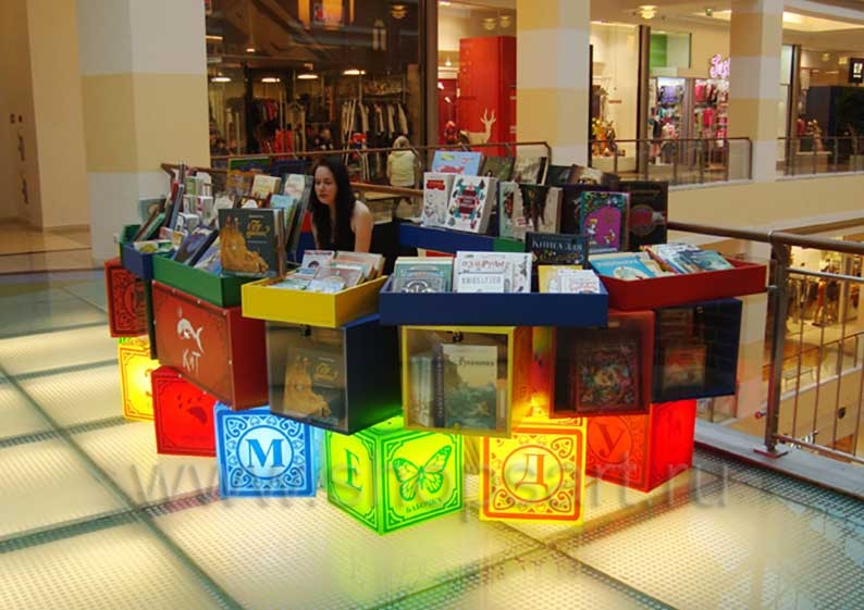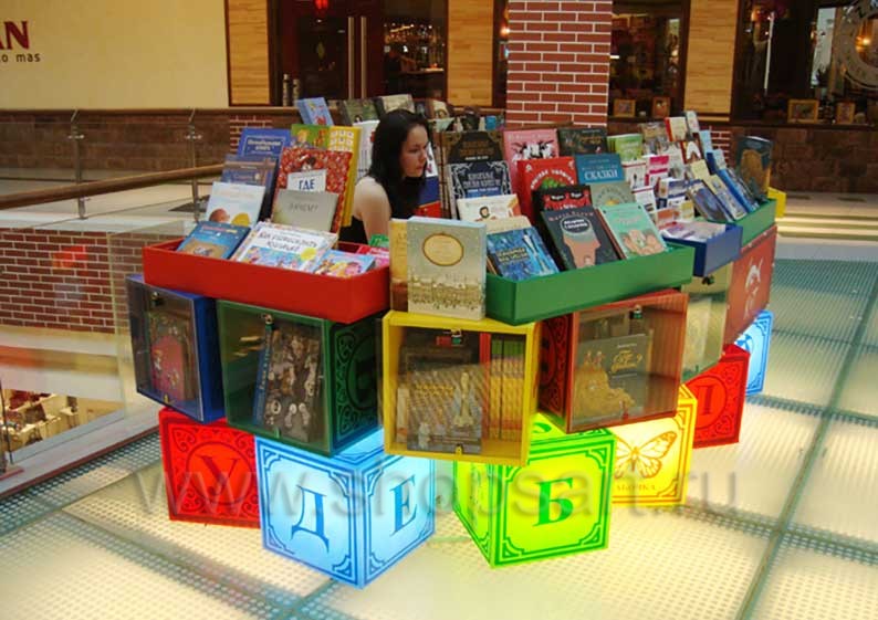 Торговое оборудование для продажи книг. Мы производим небольшие яркие островные конструкции для торговли книгами. Яркое цветовое пятно посередине торгового центра всегда привлечет к себе внимание. Незамысловатые формы, составленные в виде кубиков, выполненных с изображением букв и детских игрушек, обратит на себя внимание не только родителей, но и детей.