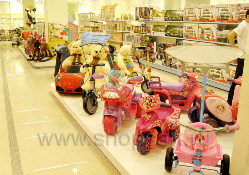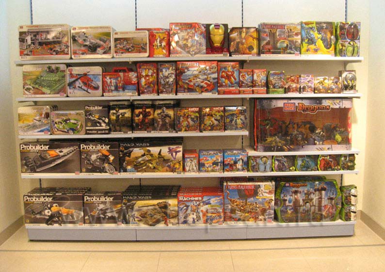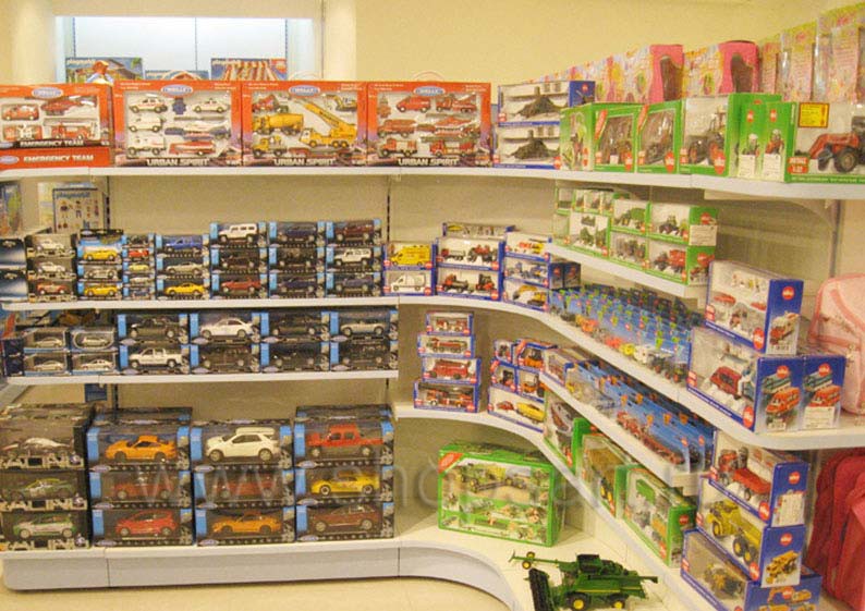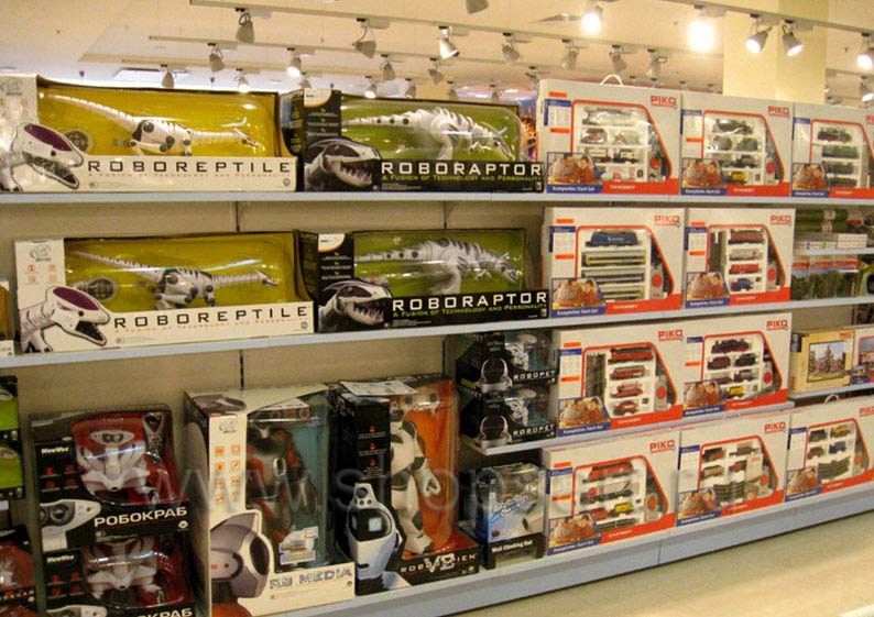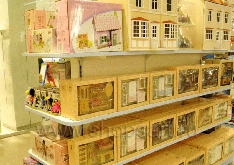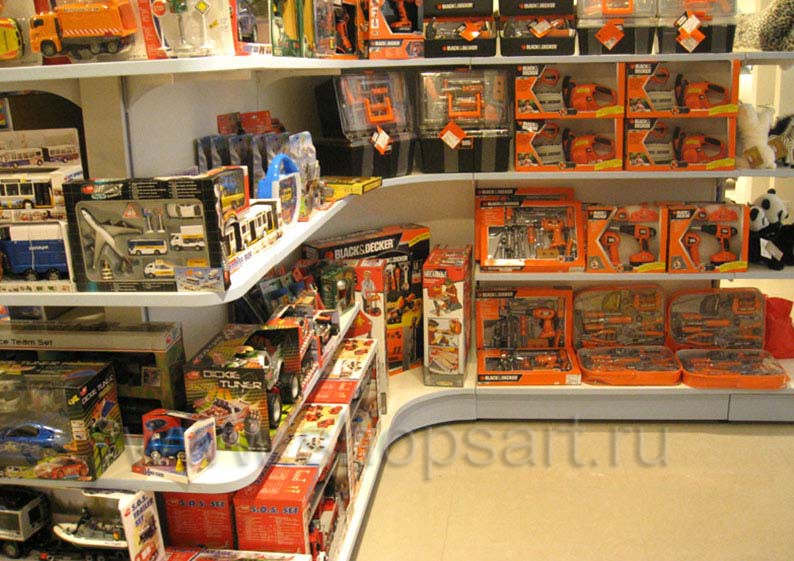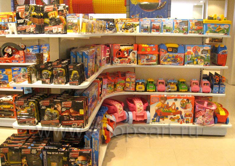 Как известно, игрушки сами по себе являются довольно яркими товарами. Поэтому желательно использовать для их размещения и демонстрации однотонное торговое оборудование.Такой подход позволит акцентировать внимание покупателей на товарах, а не на мебели.