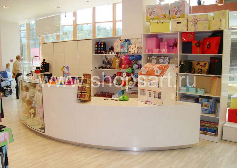 Коллекция «Цветные металлические стеллажи» оказалась идеальной основой для создания мебели для детского магазина «Винни» с нестандартной планировкой торгового зала. Были использованы пристенные и островные стеллажи различной конфигурации, которые позволили грамотно зонировать полезное пространство, создав несколько тематических отделов – для мягких и развивающих игрушек, книг, аксессуаров. Особое внимание специалисты компании «Искусство интерьеров» уделили административной стойке, совместив ее с витриной. Сзади расположились пристенные стеллажи.