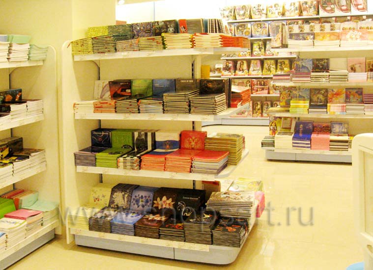 Для магазина использовались блоки пристенных стеллажей с регулируемыми по высоте полками и островные стеллажи закругленной формы, а также подиумы для демонстрации отдельных товаров. Зонирование помещения выполнялось при помощи островных групп.