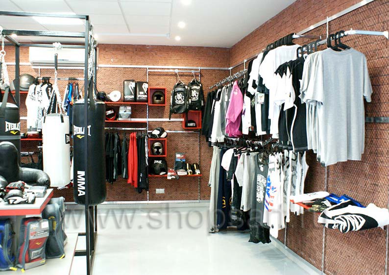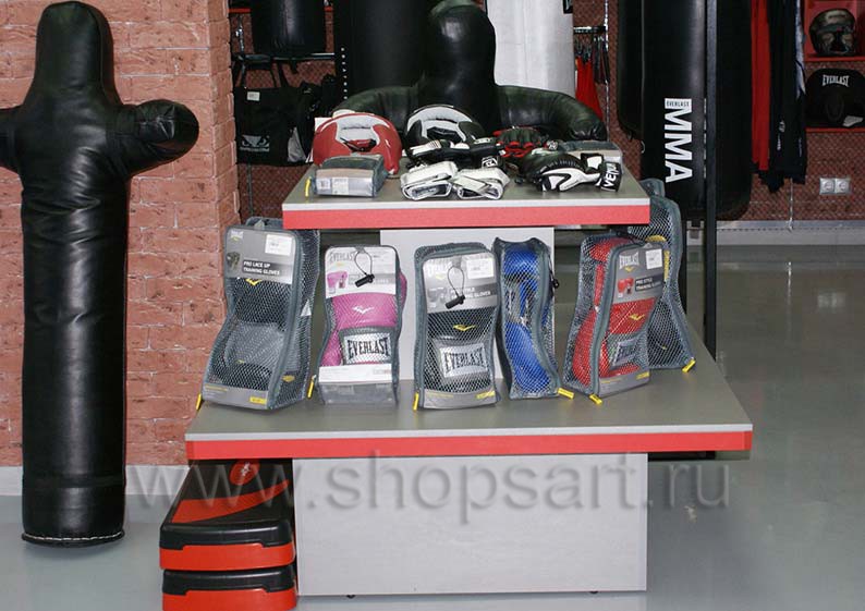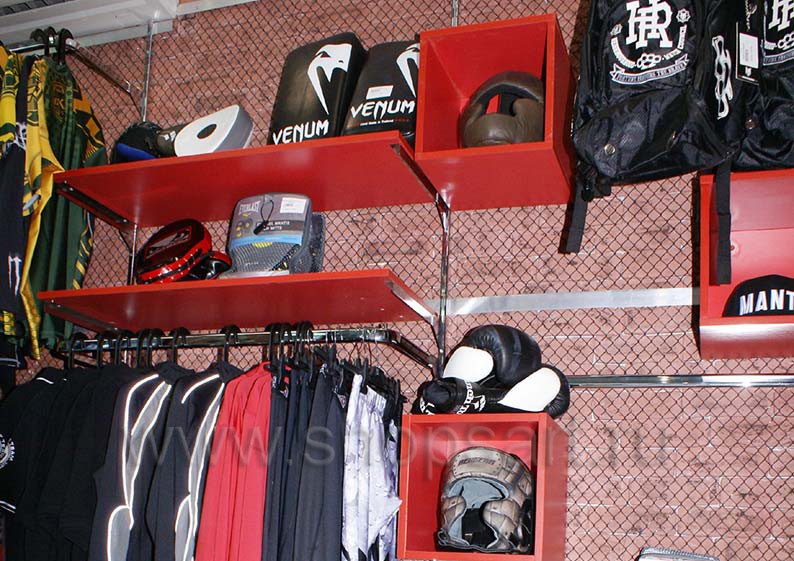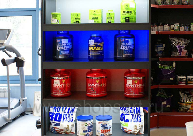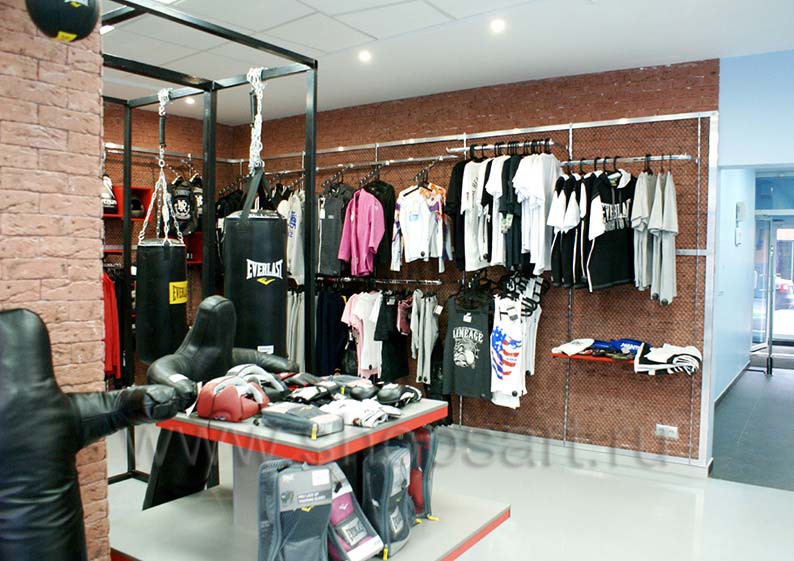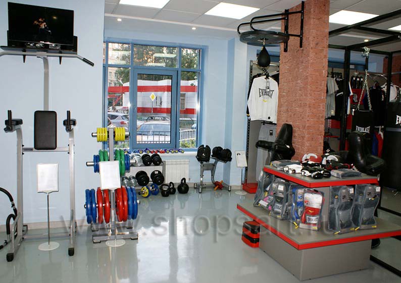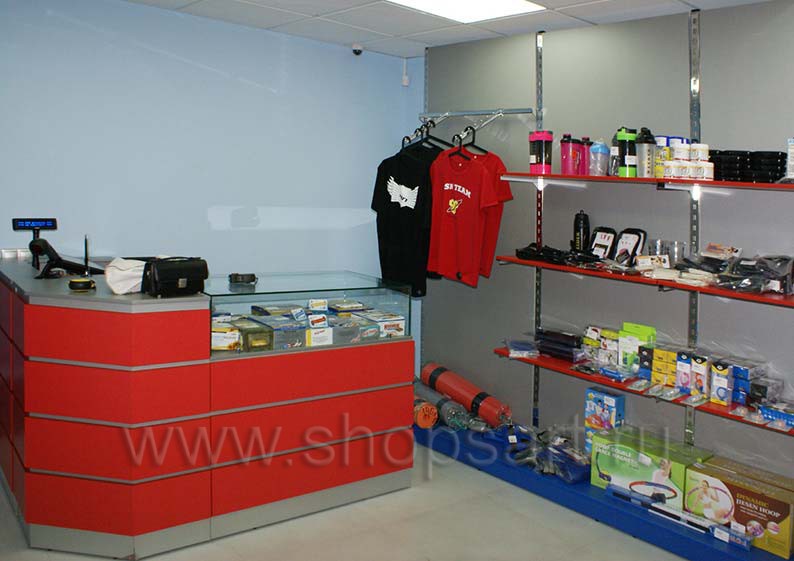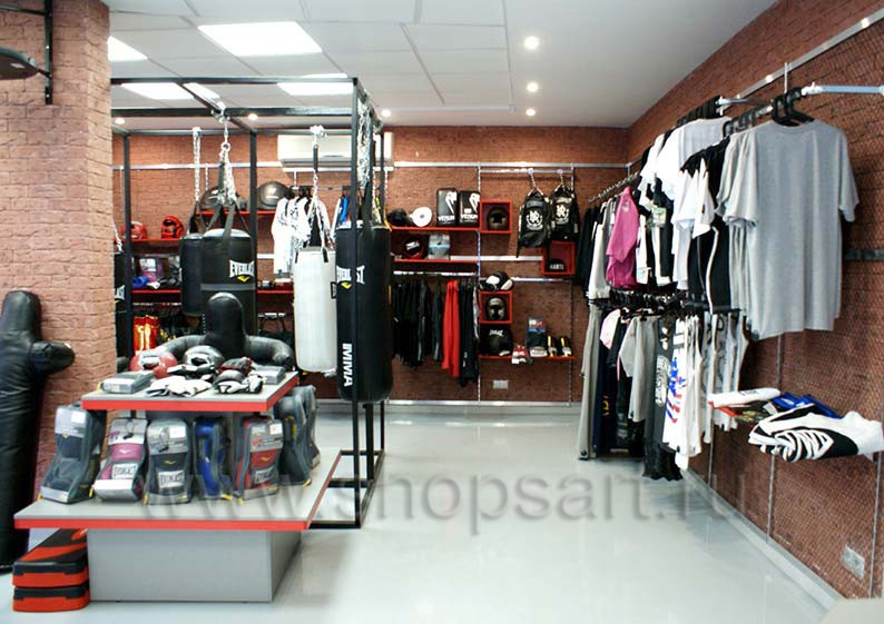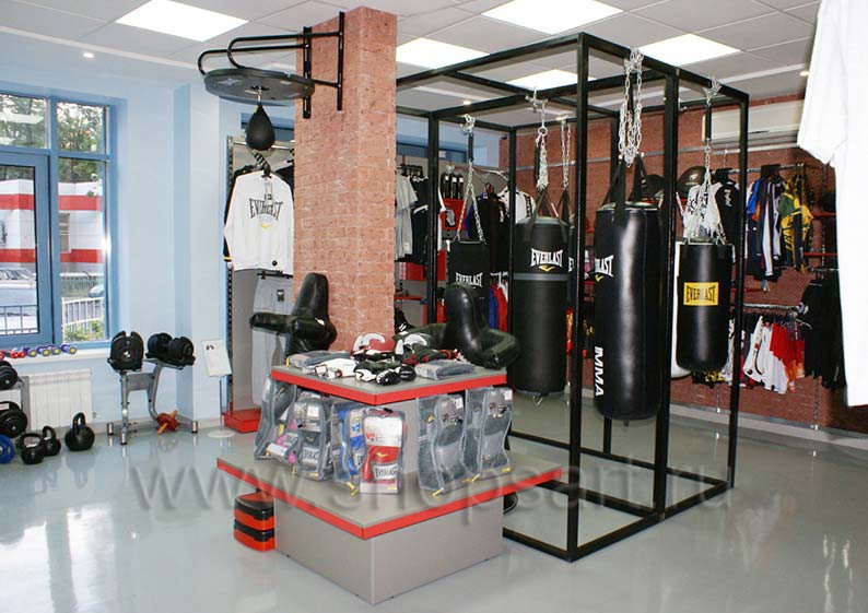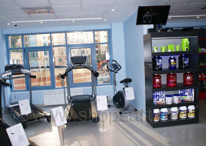 Торговые прилавки и стеллажи очень удобно применять для размещения спортивной формы и обуви. Если в магазине продается спортивное питание, то для его презентации лучше применять закрытые стеклянные витрины. Это позволит ограничить доступ посетителей к продукции. Достаточно, если продавец-консультант сам предложит оптимальный вариант покупателю из имеющегося на витрине ассортимента.