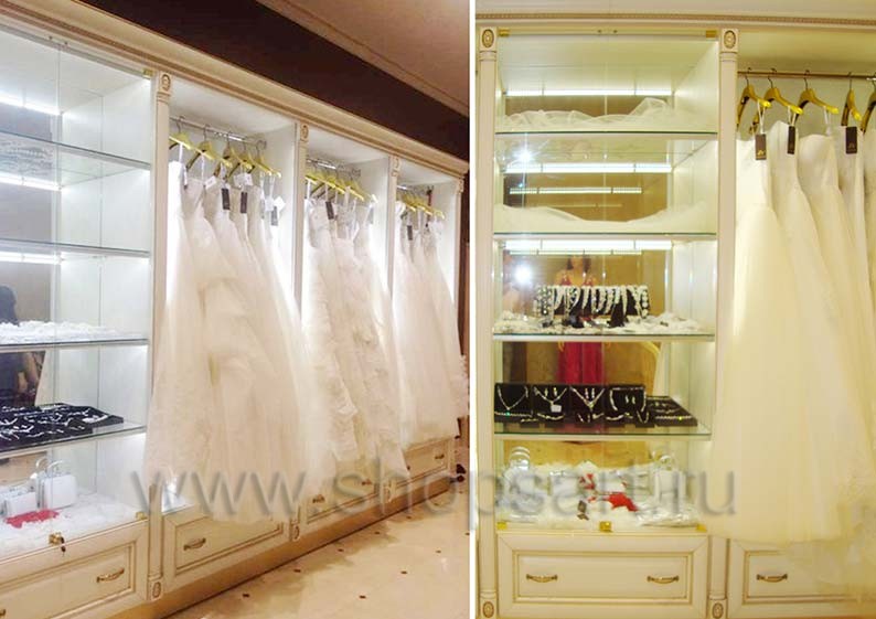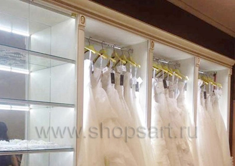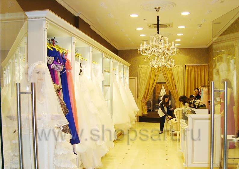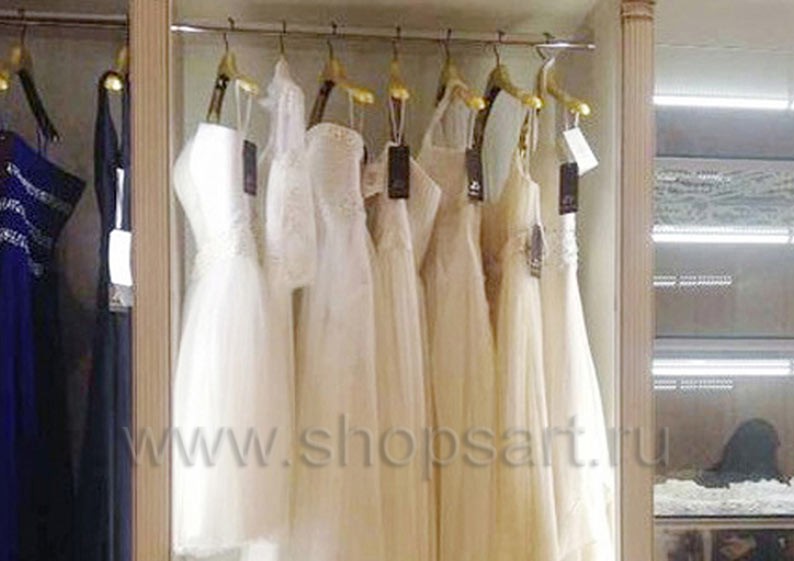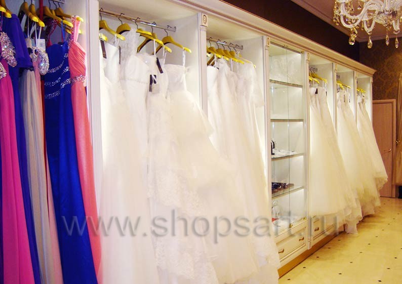 Посмотрите на фото магазинов одежды, размещенные на сайте компании ООО «Искусство интерьеров». Любая из представленных коллекций мебели отлично подойдет для оснащения свадебного салона. Это универсальное оборудование для одежды. Его можно использовать не только для демонстрации изделий повседневного гардероба, но также для презентации свадебных нарядов. Изящный декор торговых конструкций и пастельные тона сделают атмосферу салона нежной и романтичной.