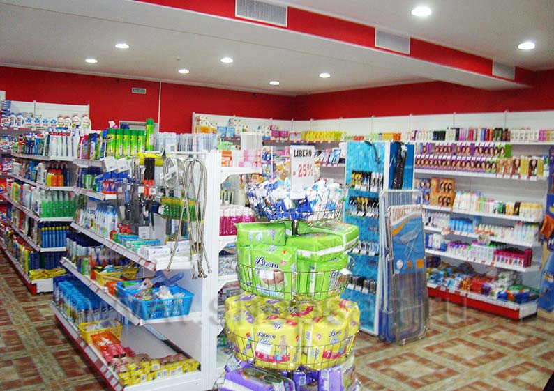 При оформлении этого торгового объекта использовались стеллажи нескольких типов – пристенные, островные, перфорированы. Дополнительно в торговом зале были установлены круговые стойки для импульсивных товаров. Все металлические конструкции решено было окрасить в белый цвет, что создало выгодный контраст с яркими стенами магазина.