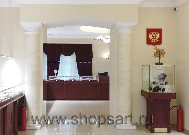 Дизайн интерьера ювелирного магазина “Октябрь”, г. Москва, Фрунзенская набережная, на основе коллекции торгового оборудования «КОРИЧНЕВАЯ КЛАССИКА»