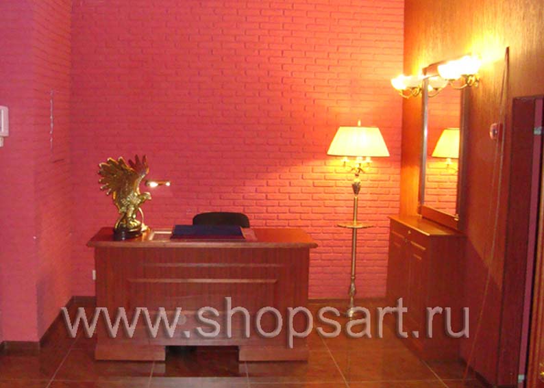 Стеллажи в магазине с российскими часами оформлены раскладкой массива дуба. Они выполнены в классическом стиле и выдержаны в благородных коричневых тонах. Такая мебель решает сразу несколько задач:
