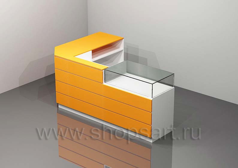 Кассовый узел, угловой, с зоной упаковки и зоной прилавка для выкладки товара. По передней части стол облицовывается декоративной рустовкой. Колпак изготовлен из стекла 8мм, УФ склейка. Цвета отделки: оранжевый, белый или любой другой.