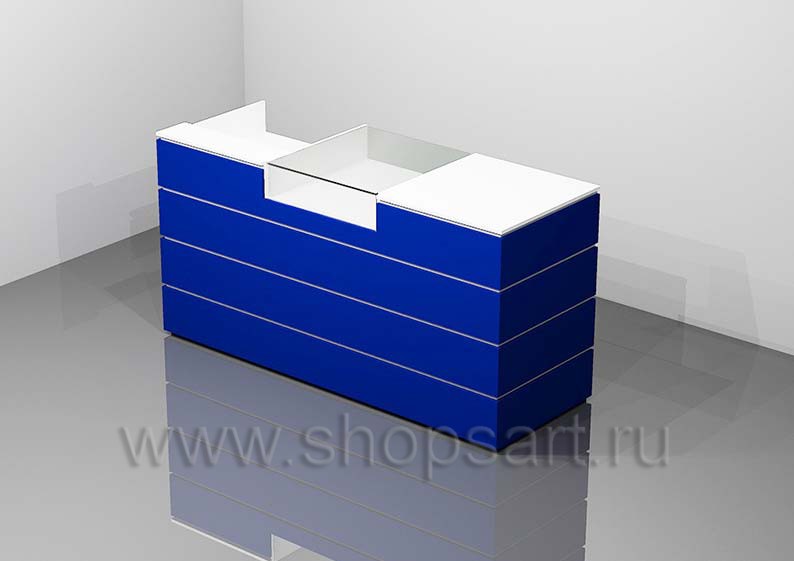 Кассовый стол с зоной упаковки и зоной прилавка для выкладки товара, по передней части стол облицовывается декоративной рустовкой. Стекло 8 мм. Цвета отделки: синий, белый или любой другой. Стол оснащается выдвижными ящиками и полками, по желанию Заказчика.