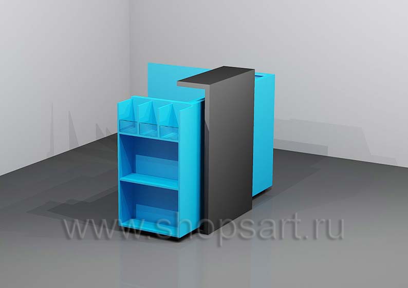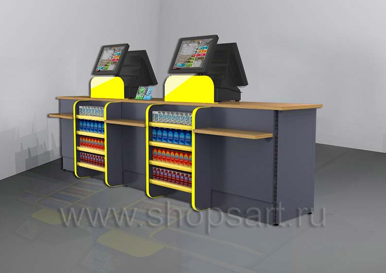 Кассовый стол, с боковым прилавком, который служит для выкладки сопутствующего товара. Прилавок снабжен ячейками и открытыми полками. Стол содержит декоративную накладку с лицевой стороны.