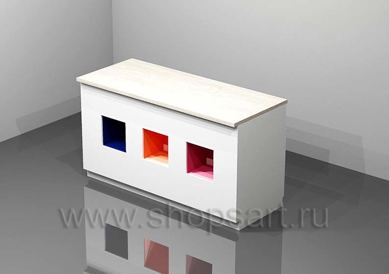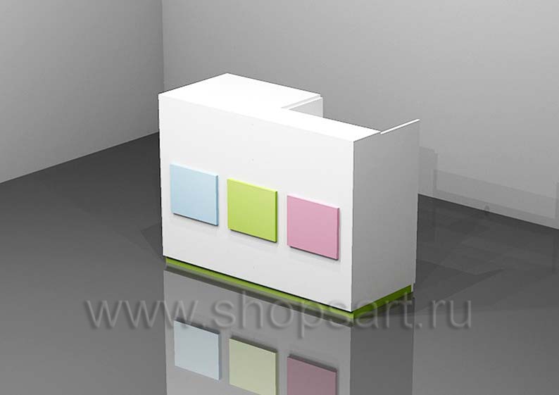 Ресепшн для детского магазина выполнен в светлых тонах, содержит декоративные ниши имеющие подсветку. Столешница – светлое дерево. Цвета ниш могут быть любыми, в соответствии с дизайном или цветовой гамме Вашего фирменного стиля.