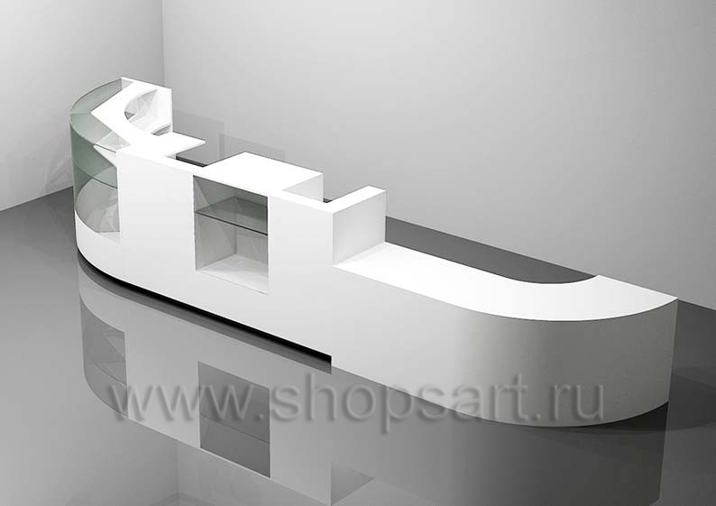 Радиусная кассовая зона состоит из кассового узла и двух стеклянных, двухуровневых прилавков, с радиусными стеклами для выкладки украшений и аксессуаров, расположенных по бокам изделия. Кассовая зона выполнена из окрашенного в белый цвет МДФ, белого ЛДСП, стекла 8мм.