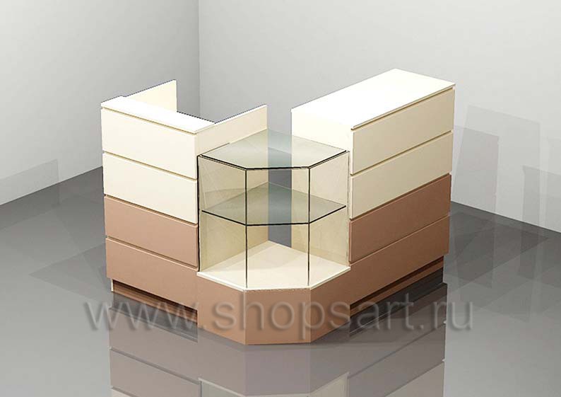Угловой ресепшн включает в себя кассовый стол, витрину со стеклянными полками для выкладки товара и зону упаковки с накопителем. Изделие выполнено из ЛДСП – Крем, Медь. По желанию Заказчика витрина может иметь светодиодную подсветку.