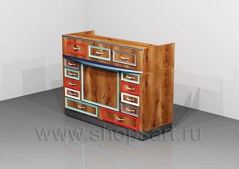 Стол под кассу, с имитацией ящиков и ручек. Создаст яркий образ для любого магазина. Материал: голубой ЛДСП, рамки — массив дерева тонируемый в любой цвет.