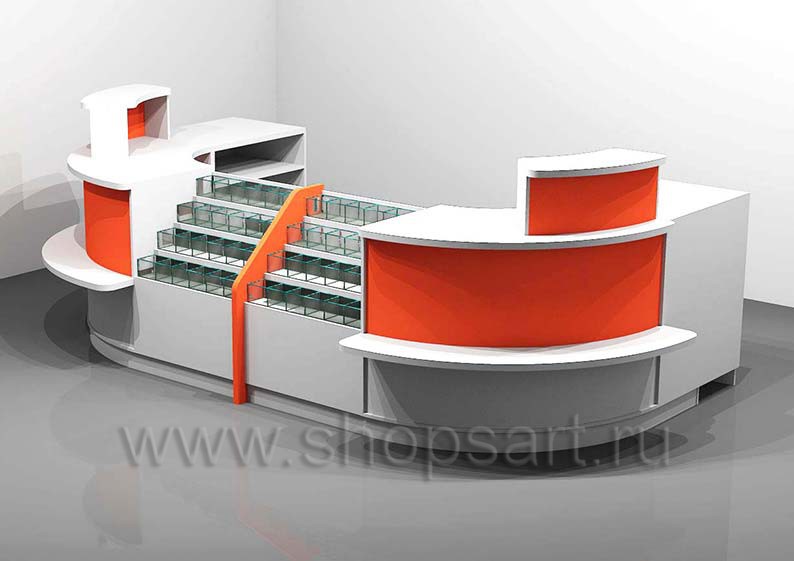 Радиусный кассовый блок состоит двух рабочих мест для работы кассиров, бокового прилавка и зоны упаковки товара. Прилавок используется для демонстрации сопутствующего мелкого товара в стеклянных ячейках. Материал: стекло 6 мм., оранжевый и серый ЛДСП, или другой, соответствующий дизайну торговой точки.