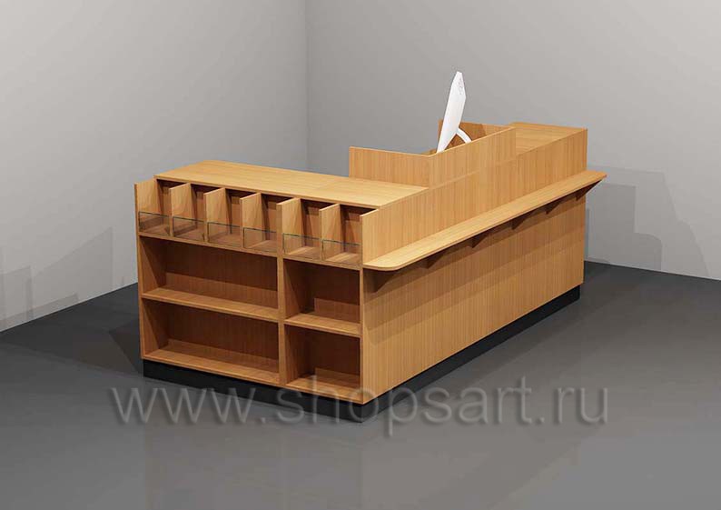 Стойка под кассу на одно и более мест кассира, кассовые аппараты и мониторы ставятся на нижней столешнице. По передней части стойки устанавливается бортик для сумок. Материал: ЛДСП, массив дерева, тонируемый в любой цвет.