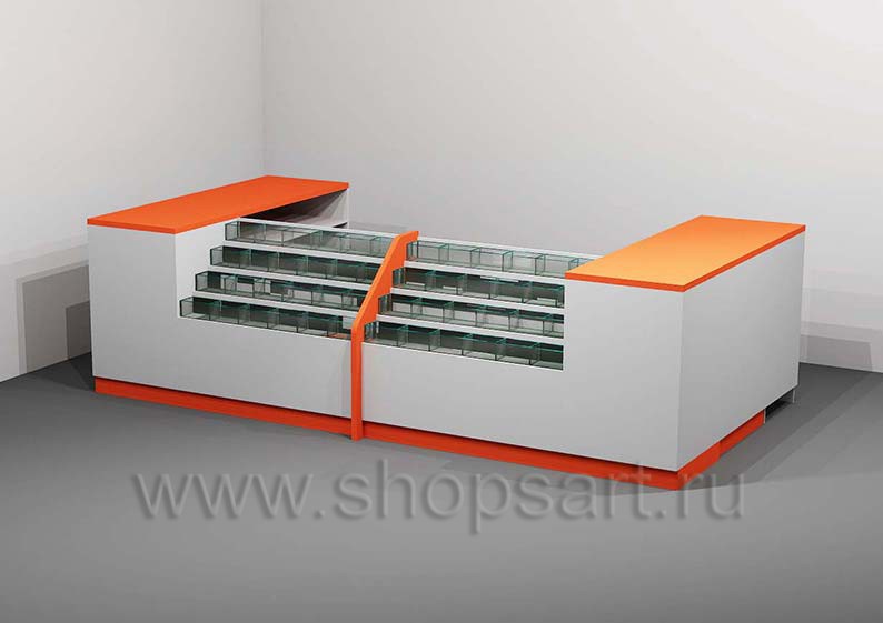 Стол кассовый для двух рабочих мест кассиров также используется для демонстрации мелкого товара в ячейках со стеклянными перегородками. Материал: оранжевый и серый ЛДСП, стекло.