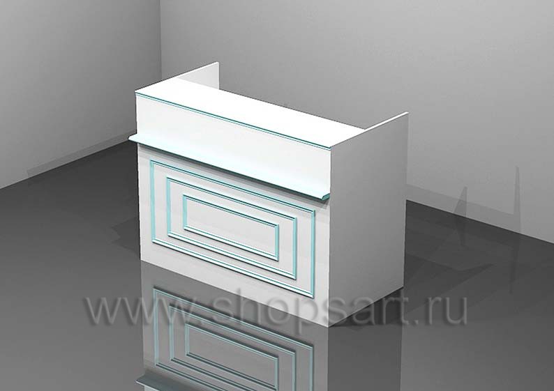 Ресепшн в классическом стиле с раскладкой из натурального дерева, тонированном в голубой цвет. Этот дизайн ресепшена подойдет для магазина белья и или детского магазина. Материал: ЛДСП, раскладка из массива дерева, которая может быть тонирована в любой цвет.