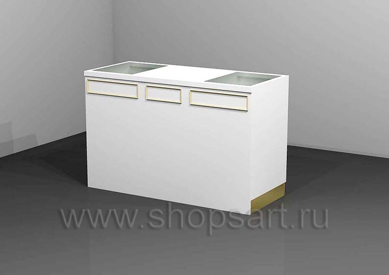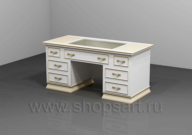 Стол демонстрационный, с выдвижными ящиками и прилавками, имеющими стеклянный верх. Материал: ЛДСП, массив дерева которое тонируется в любой цвет. Стол используется для демонстрации украшений и аксессуаров.