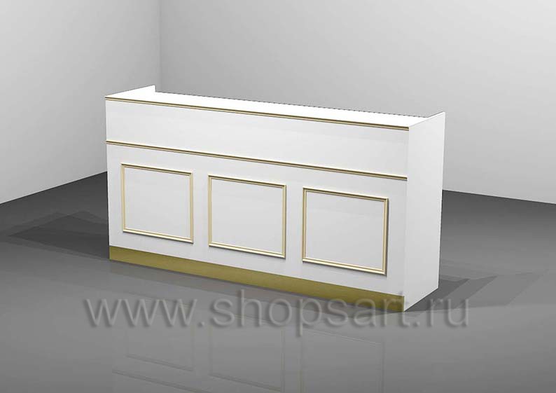 Стол под кассу на одно и более мест кассира, кассовые аппараты и мониторы ставятся на нижней столешнице. Передней часть стола декорируется золотыми раскладками из массива дерева. Материал: ЛДСП, массив дерева, тонируемый в любой цвет.