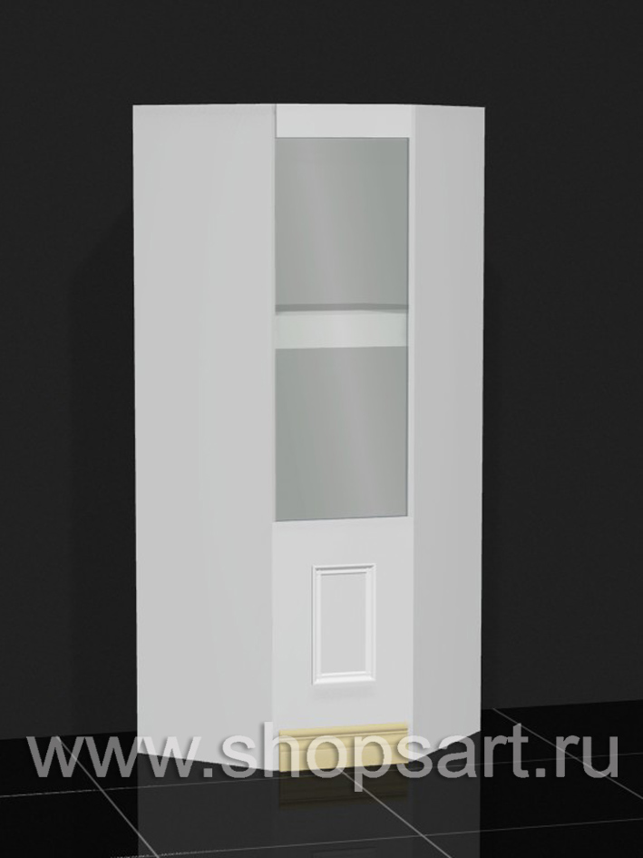 . ЛДСП белого цвета, полки ЛДСП, пластик, дверки стеклянные распашные гнутые. Золотая фурнитура (замки и петли). Габаритные размеры : высота 2114мм., ширина 300мм., глубина 300мм. Ножки — регулируемые. Две декоративные колонны с элементами массива дуба, карниз.