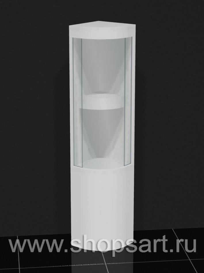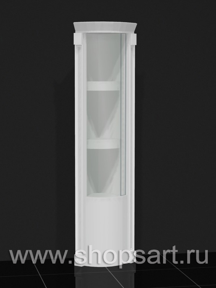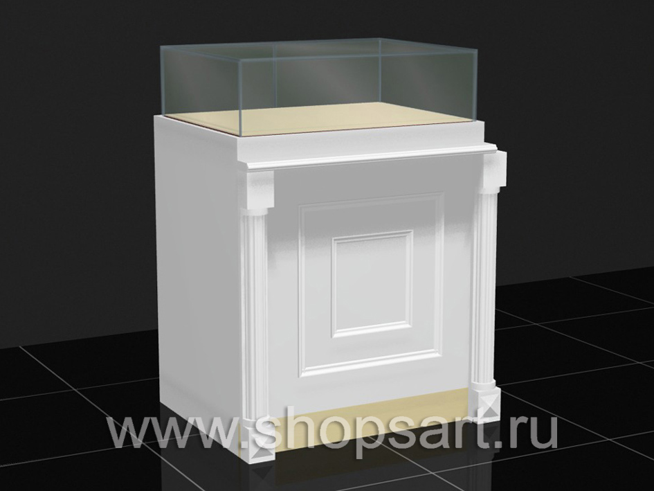 Стеклянный колпак из стекла 8мм., склейка УФ, дверки распашные, золотая фурнитура (замки и петли). Куб крайний с колоннами. Ножки регулируемые. Цоколь ЛДСП белого цвета., высота 1620мм., ширина 582мм, глубина 582мм.