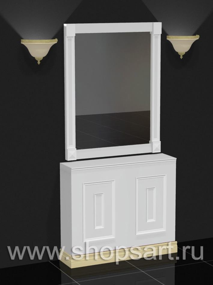 18. Тумба с зеркалом из ЛДСП белый цвет, с декоративной раскладкой из массива дуба.