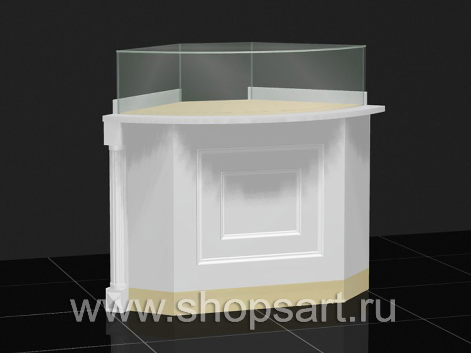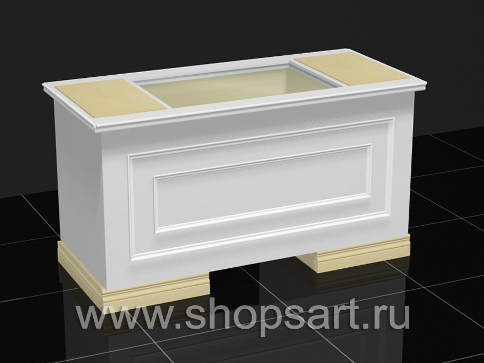 Изготавливается из белого ЛДСП или глянцевого МДФ. В верхней части устанавливается колпак с распашными дверками, с замком. Стекло 8мм. Склейка УФ. Золотая фурнитура (замки и петли). Ножки регулируемые. Цоколь покрыт пластиком цвета золота.
