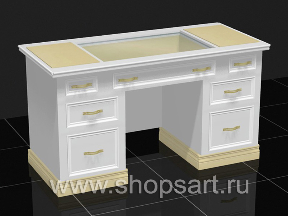- 06. Стол демонстрационный с выдвижными ящиками и стеклянным прилавком 800х1400х600 мм.